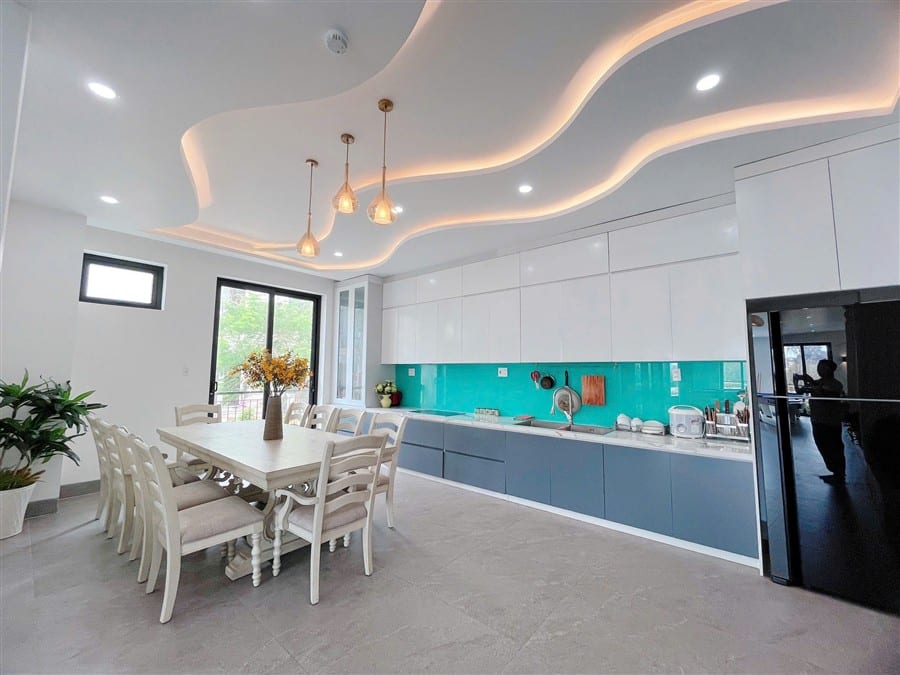 Khu bếp đầy đủ gia vị, trang bị lò vi sóng, 3 bộ nồi lẩu, bếp từ, ấm siêu tốc…đầy đủ xoong nồi chảo, chén bát sẵn sàng phục vụ đoàn 40 khách