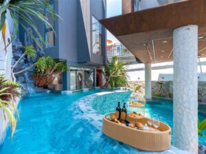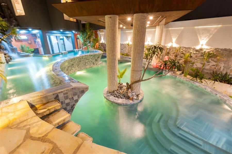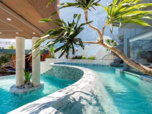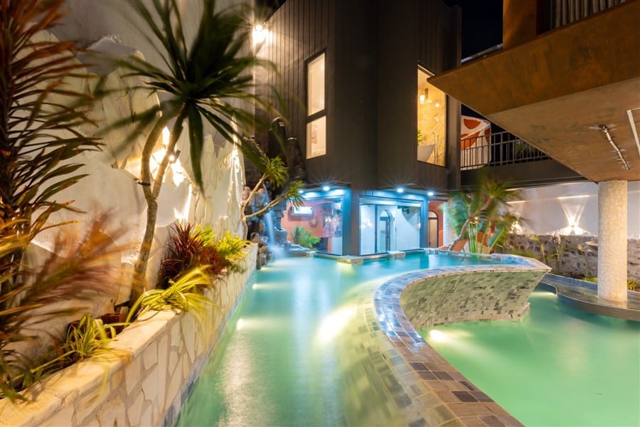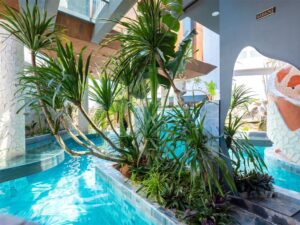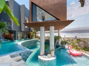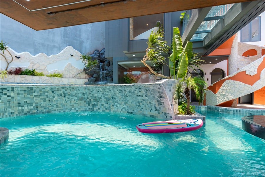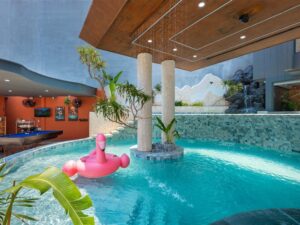 ( Kính trong suốt nhìn ra hồ bơi )