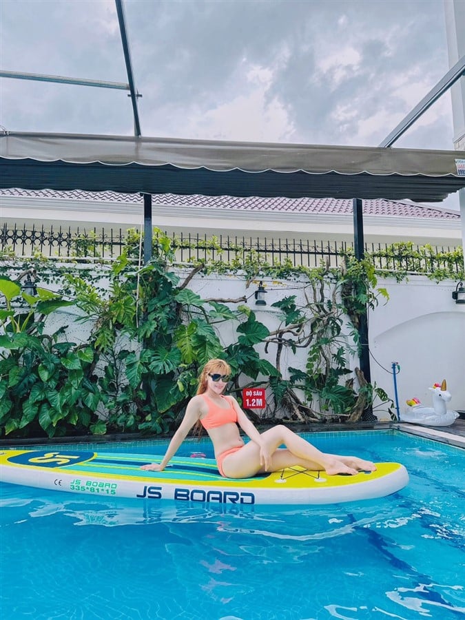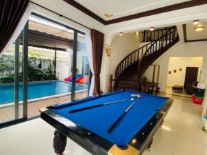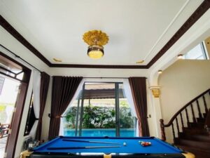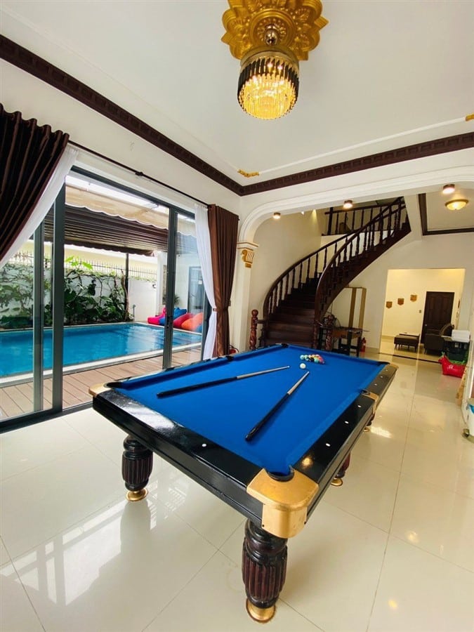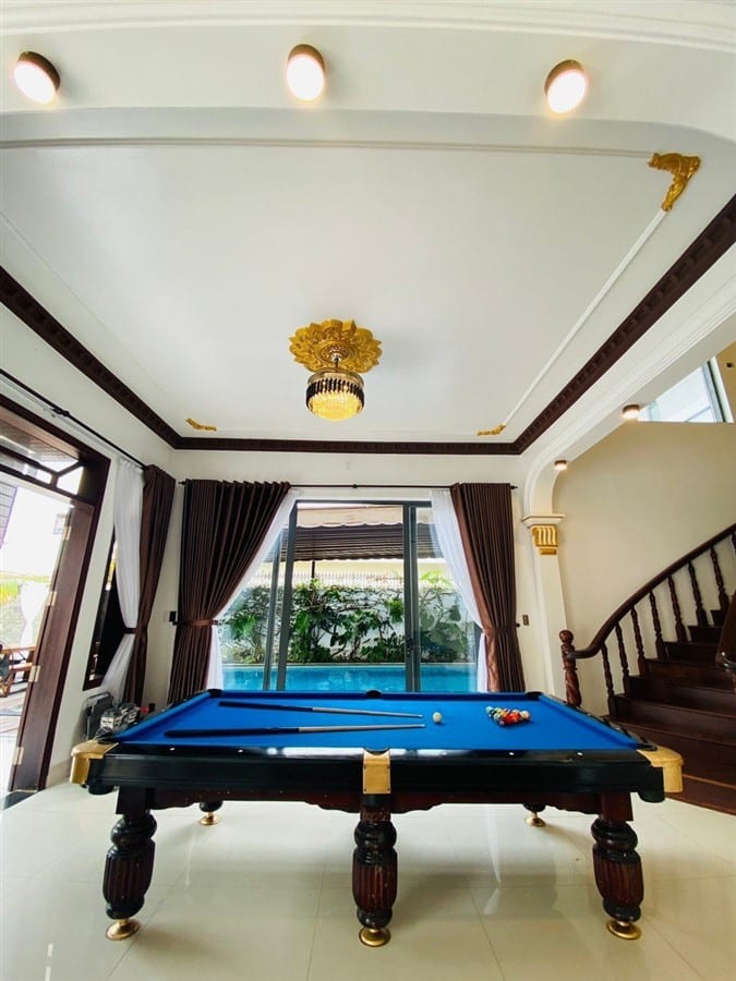 Tiện ích / Mô Tả: Hồ Bơi : 70m2, Bi da free/karaoke, Mặt tiền đậu xe oto thoải mái